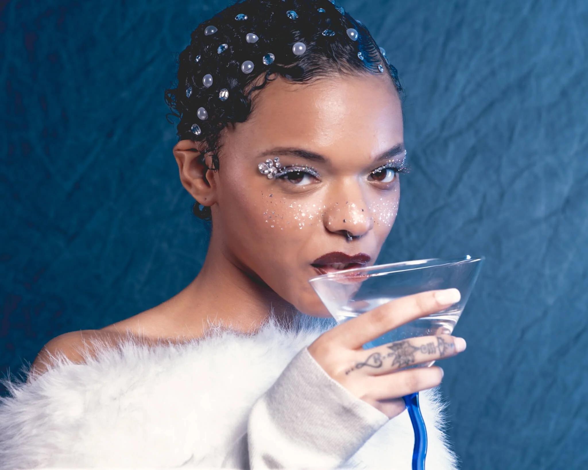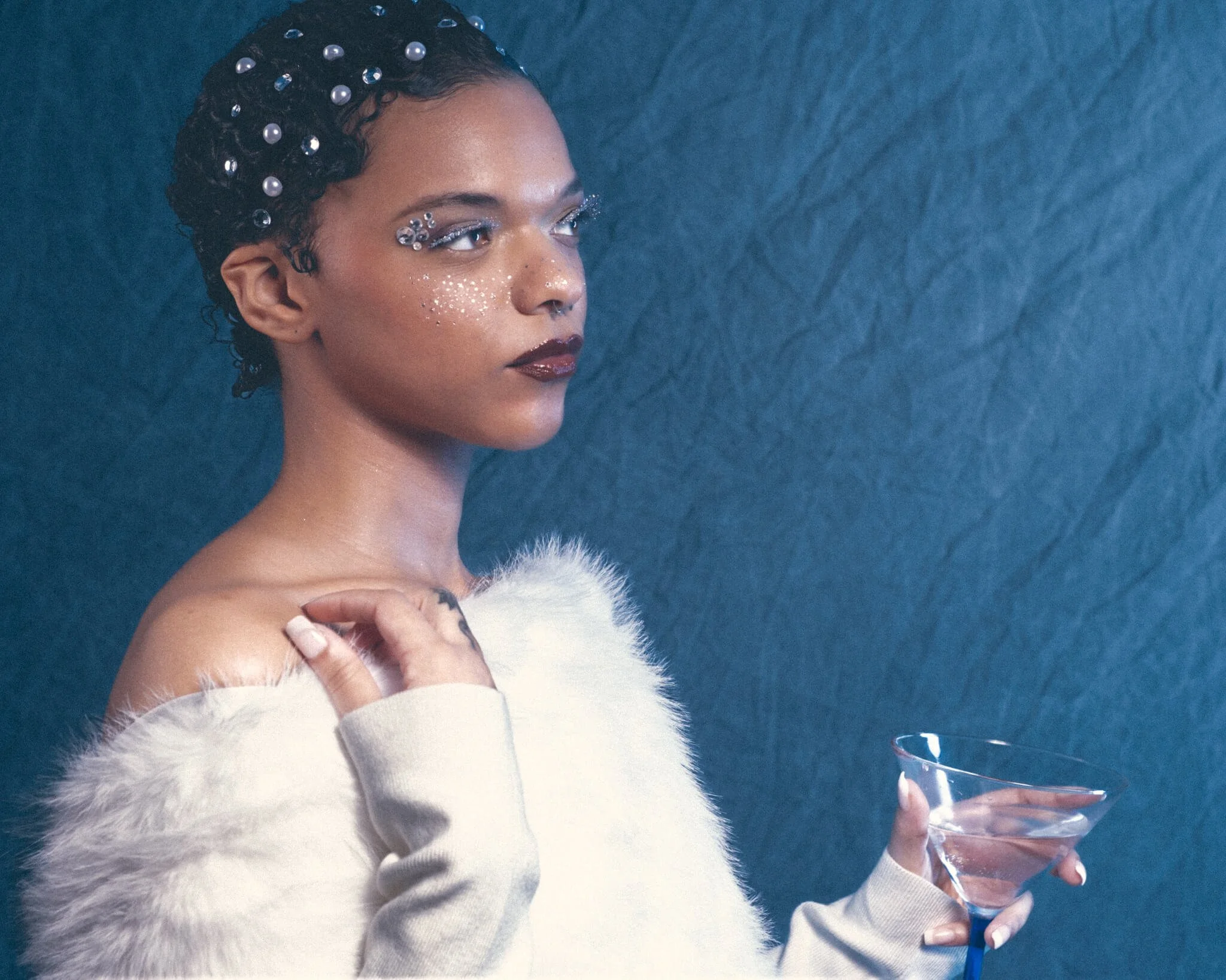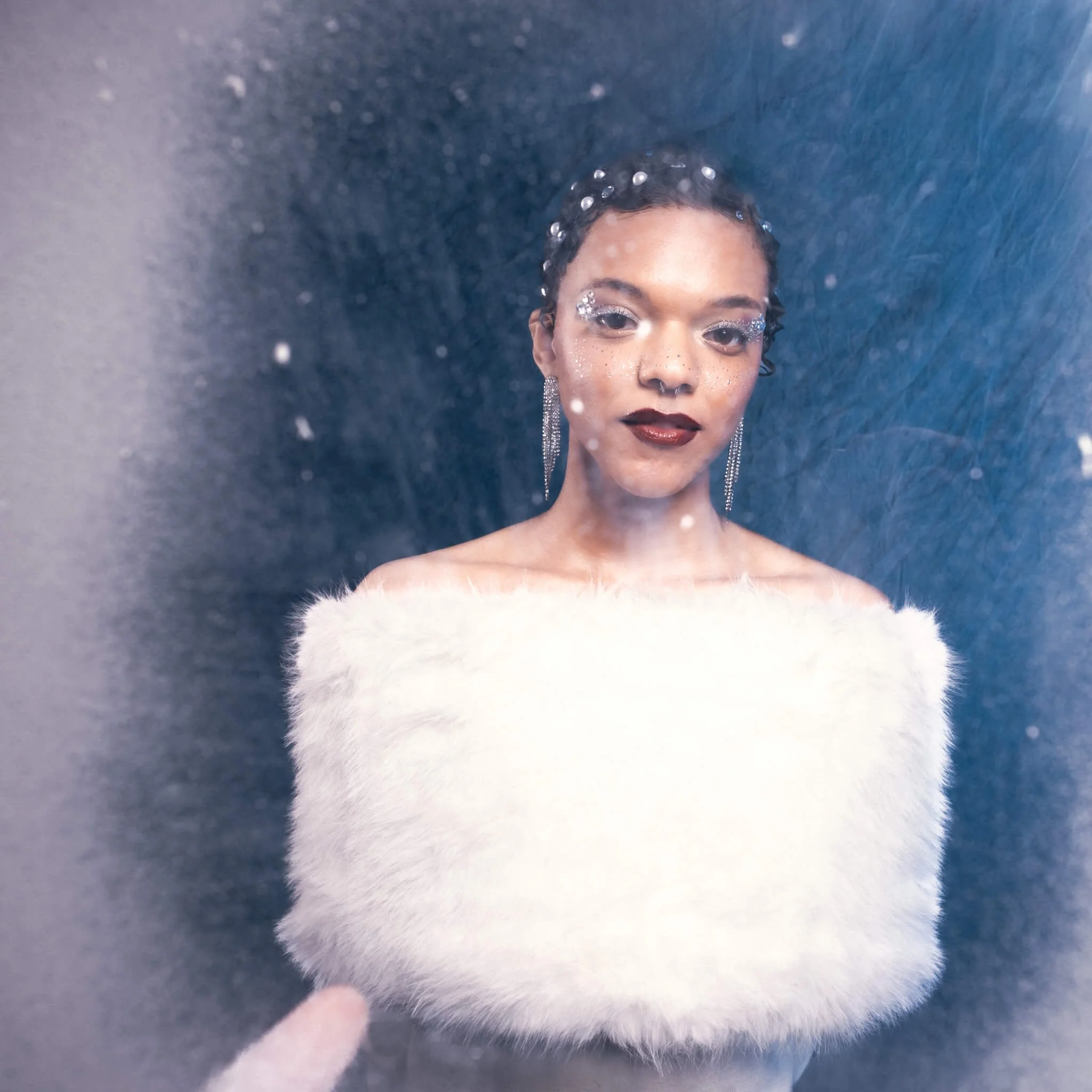 We kept it simple but intentional with a canvas backdrop, gelled studio lighting to create those deep teal tones that feel like you're lost in a winter dream, and a wardrobe that screamed elegant, regal, fancy as hell. White fur, sleek lines, pearls threaded through our model's hair like little frozen dewdrops. The whole vibe was ice queen meets Old Hollywood glamour.